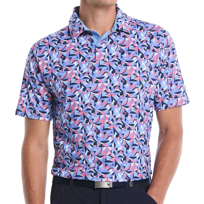 A bolder look from Callaway, with this short sleeve polo, featuring an all over multi color abstract dogwood floral design in tones of purple, pink, white, and black. Crafted with their SwingTech technology to move with you with performance and ventilated to keep you cool and comfortable.