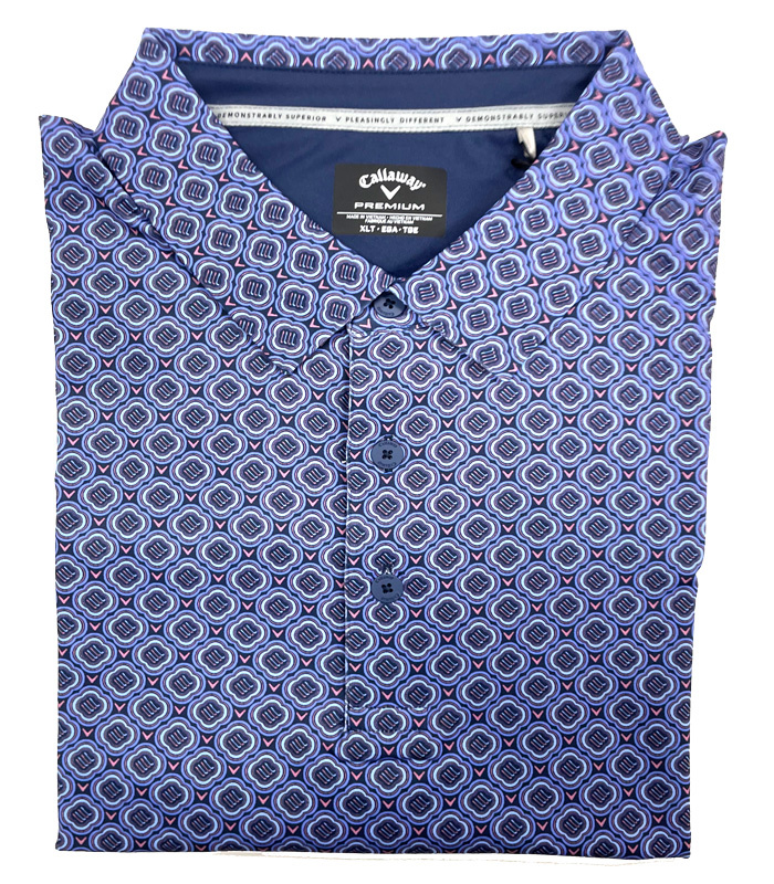 New this spring, a cool all over golf club geo print with the chevron logo. Subtle and sophisticated to give the not so navy polo a touch of style. Crafted with Callaway's SwingTech technology to move with you with performance and ventilated to keep you cool and comfortable.