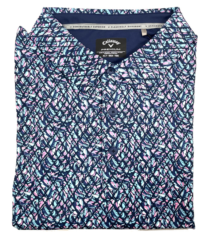 A tropical look from Callaway, with this short sleeve polo, featuring an all over multi color palm print on a navy background. Crafted with their SwingTech technology to move with you with performance and ventilated to keep you cool and comfortable.