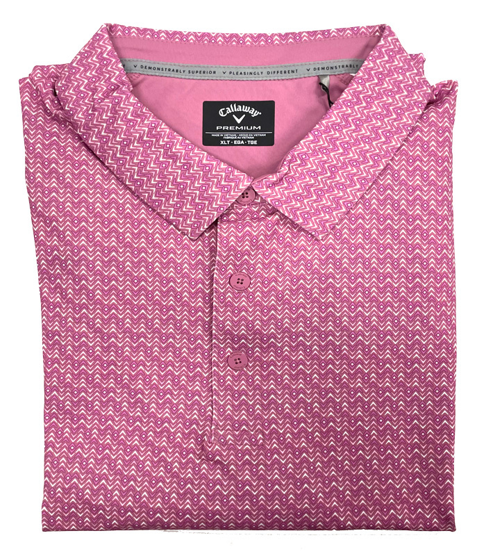 New this spring, Callaway's timeless chevron print done in shades of rose. Subtle and sophisticated to give a look of a solid color polo some style when up close. Crafted with Callaway's SwingTech technology to move with you with performance and ventilated to keep you cool and comfortable.