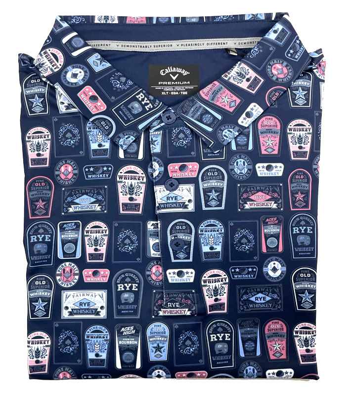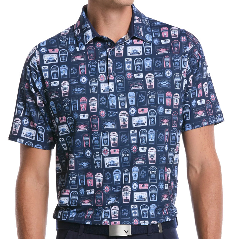 New this spring, a cool all over square design featuring whiskey bottles on a peacoat background. Crafted with Callaway's SwingTech technology to move with you with performance and ventilated to keep you cool and comfortable.