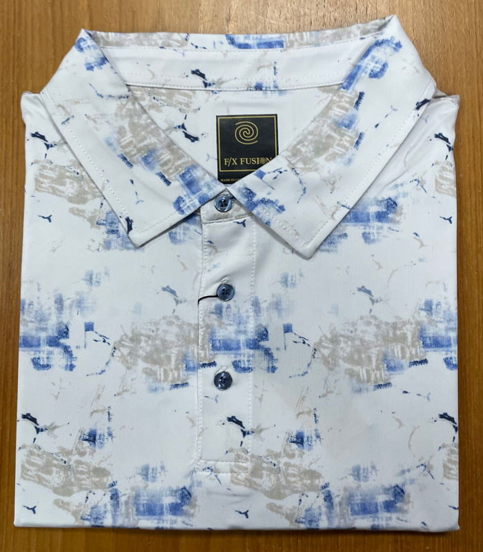 A great new short sleeve polo from F/X Fusion, featuring an abstract brush stroke print design. It is subtle but sophisticated in shades of navy and khaki on a white background. A perfect look with jeans or khaki shorts. Crafted from a polyester and spandex blend so you are comfortable and looking your best all day long.