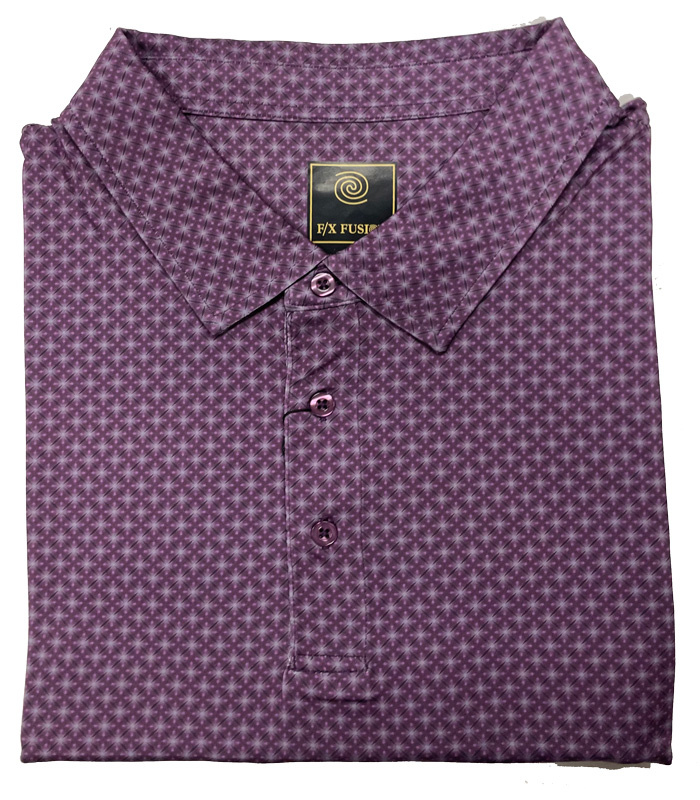 A cool print in a great new short sleeve polo from F/X Fusion. This printed pattern polo features a foulard diamond pattern in tones of mauve and black. With a touch of spandex, this polo will move with you for comfort.