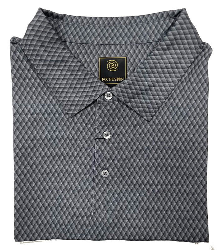 A cool print in a great new short sleeve polo from F/X Fusion. This printed pattern polo features an all over stacked diamond pattern in shades of gray. With a touch of spandex, this polo will move with you for comfort.