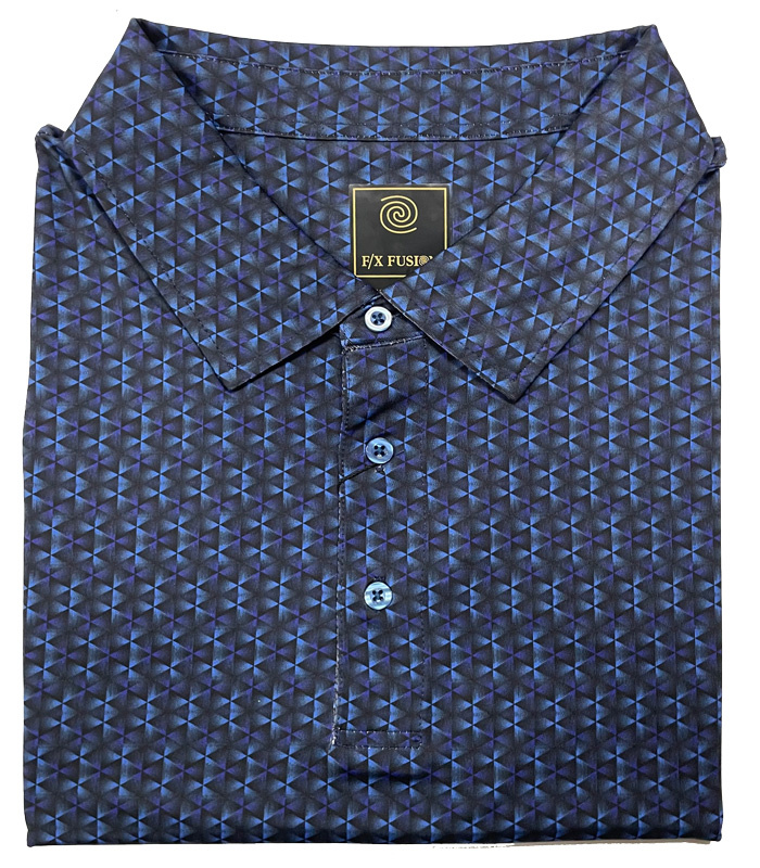 A cool new short sleeve polo from F/X Fusion, featuring an all over triangle print design. It is a sophisticated pattern in various shades of blue and black. Crafted from a polyester and spandex blend so you are comfortable and looking your best all day long.