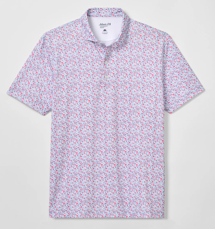 The Charmer short sleeve Polo from Johnnie-O, is part of their prep-performance jersey line. This line features 4 way stretch, to move with you, and moisture wicking properties to keep you cool and comfortable. The Charmer features an all over micro print design of hearts and 4 leaf clovers in subtle colors of aqua and pink on a white background with the Johnnie-O logo embroidered at center back yoke.