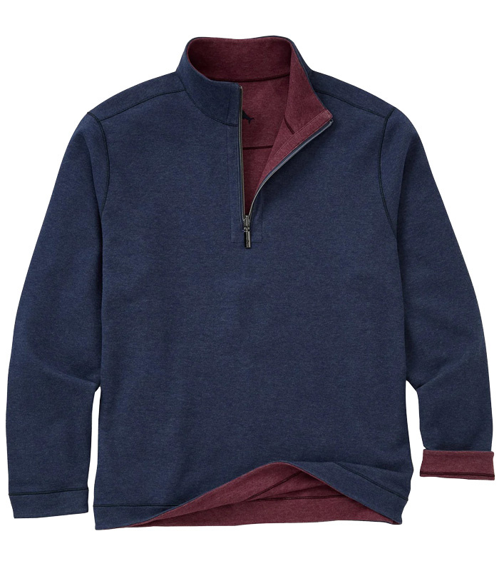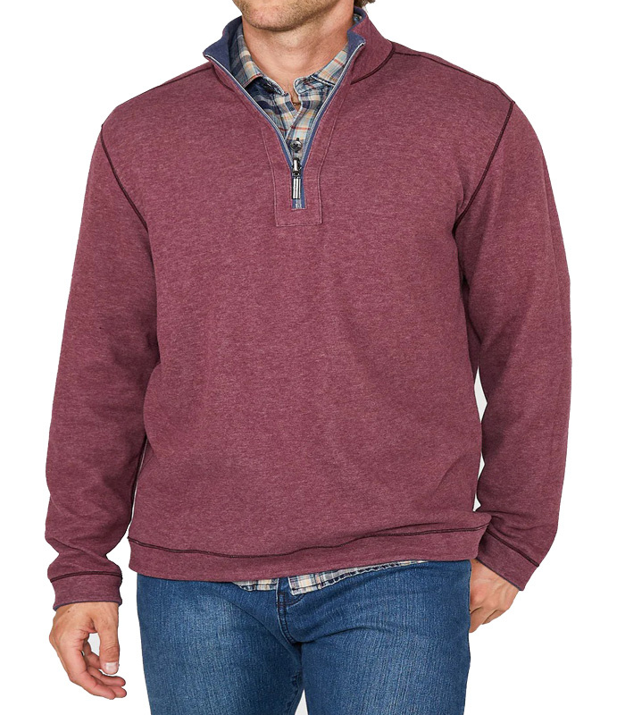 Two great looks for the price of one in this Flipview 1/2 zip pullover from Tommy Bahama. Cobalt blue on one side then it reverses to a burgundy heather on the other with cover stitch detailing at the seams. This luxe sweatshirt upscales the casual look we are all wearing today.