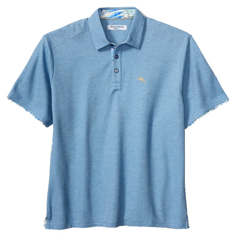 As Jimmy Buffer would say " It's 5 O'Clock somewhere" and this Palm Dancer Polo from Tommy Bahama is the perfect item. A performance solid short sleeve polo featuring Tommy Bahama's Island Zone technology with the whimsy of a tropical print design trimming the inside placket, collar and cuffs and a marlin embroidered logo at left chest.