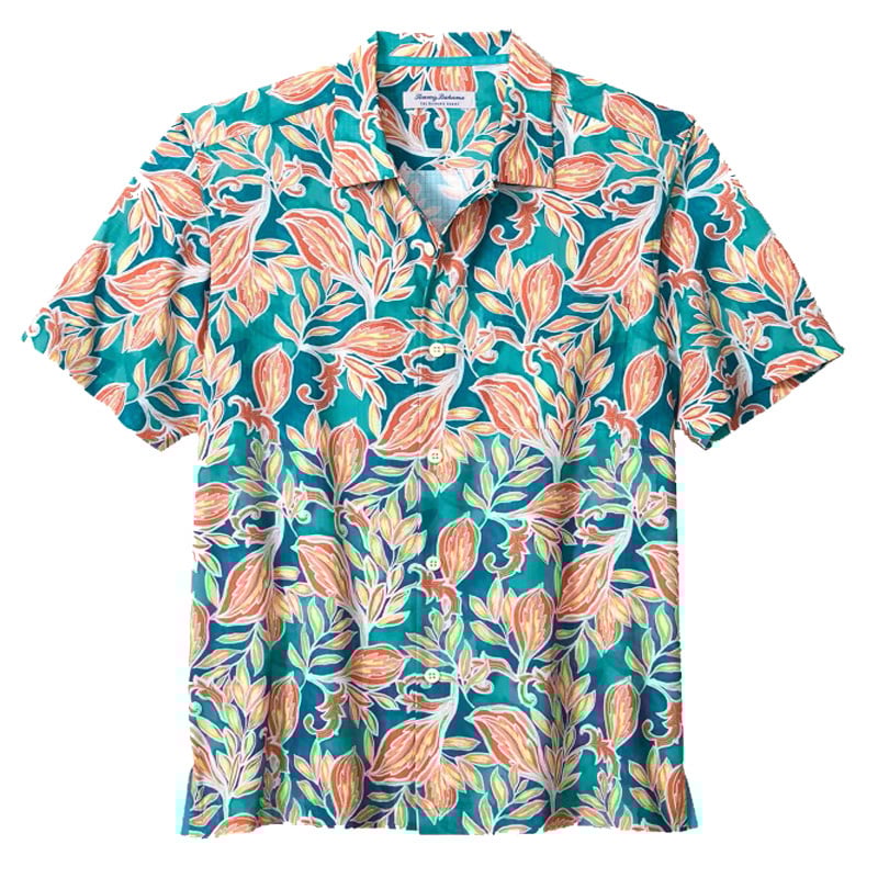 The Bahama Coast Wild Vines short sleeve camp shirt from Tommy Bahama is all about style, comfort and breathability. Crafted with not only with a touch of stretch for comfort but with their IslandZone moisture wicking properties as well. The fabric has tiny perforations that breaths with air flow. Going on a trip? This shirt is travel ready with it wrinkle resistant fabric. This shirt has a vibrant tropical print on a teal background.