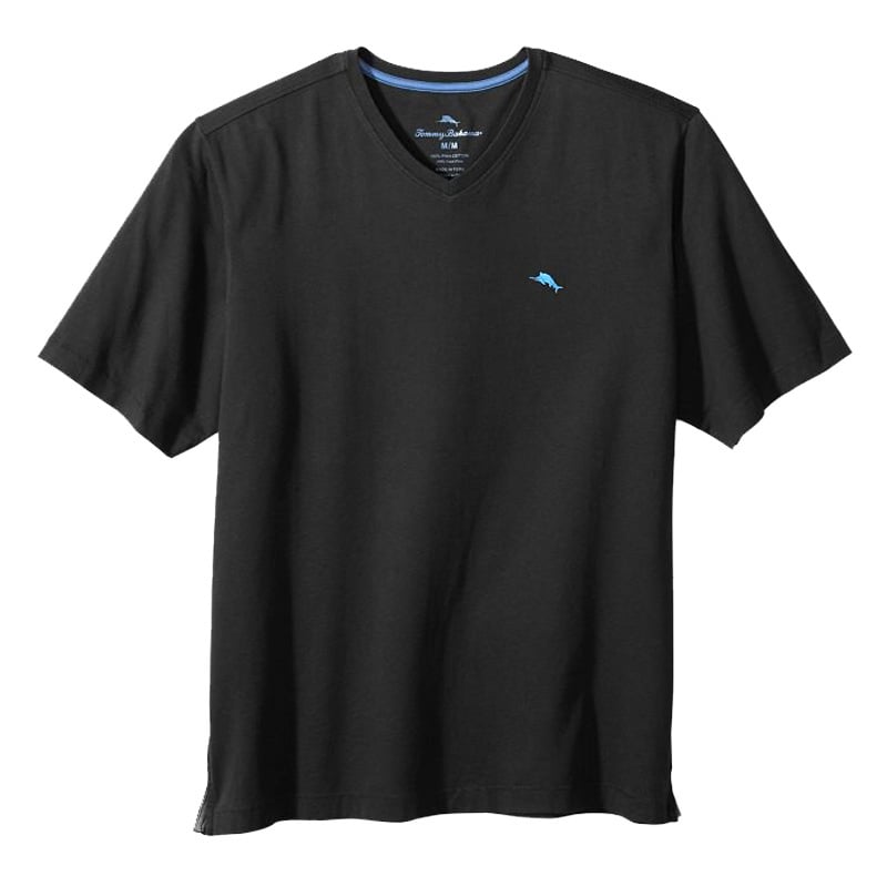 The Tommy Bahama New Bali Skyline V-neck tee shirt is crafted from 100% soft pima cotton jersey which keeps you cool and comfortable. A short sleeve shirt with a v-neck opening and a patch pocket at left chest embroidered with the sailfish.